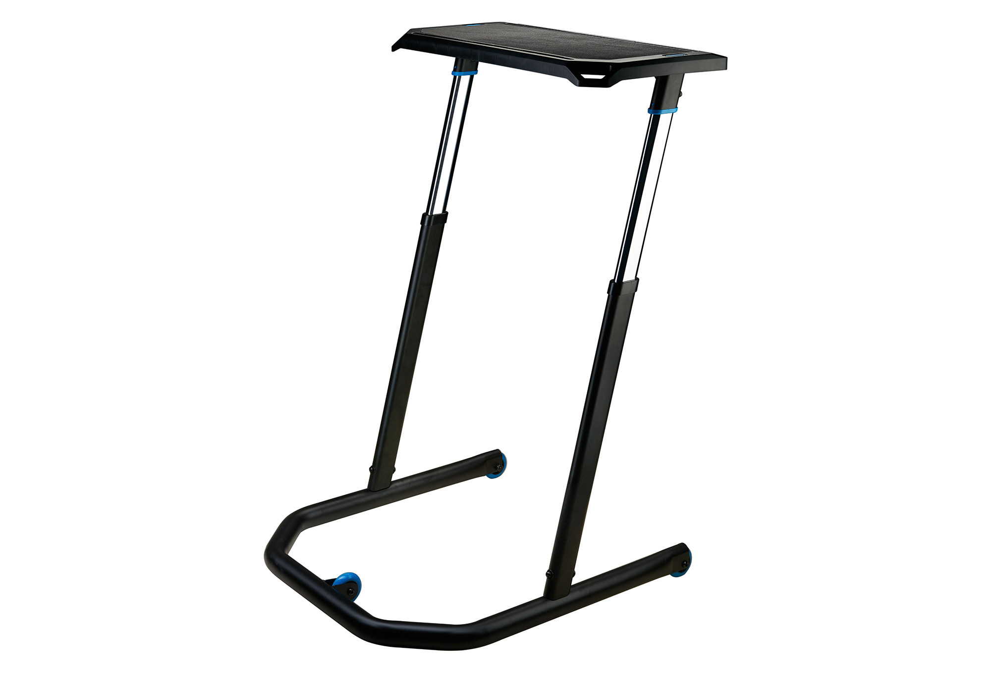 Le bureau d’entraînement ajustable Wahoo Fitness Kickr est conçu pour vous permettre d’accomplir plusieurs tâches en même temps. Utilisez-le en tant que bureau lors de vos séances de home-trainer ou en tant que bureau en position debout dans votre bureau. Il est entièrement ajustable afin d’optimiser facilement son utilisation dans les positions suivantes : Position debout, position assise droite, pédalage avec les mains sur les poignées, pédalage en descente ou pédalage avec prolongateurs triathlon. Le bureau Kickr dispose de supports intégrés pour smartphone et tablette. Le cadre en acier assure la robustesse du bureau, tandis que sa surface antidérapante maintient tous les objets en place, même si vous transpirez beaucoup.