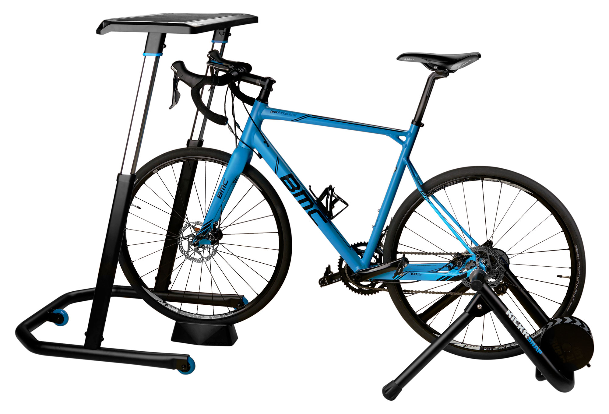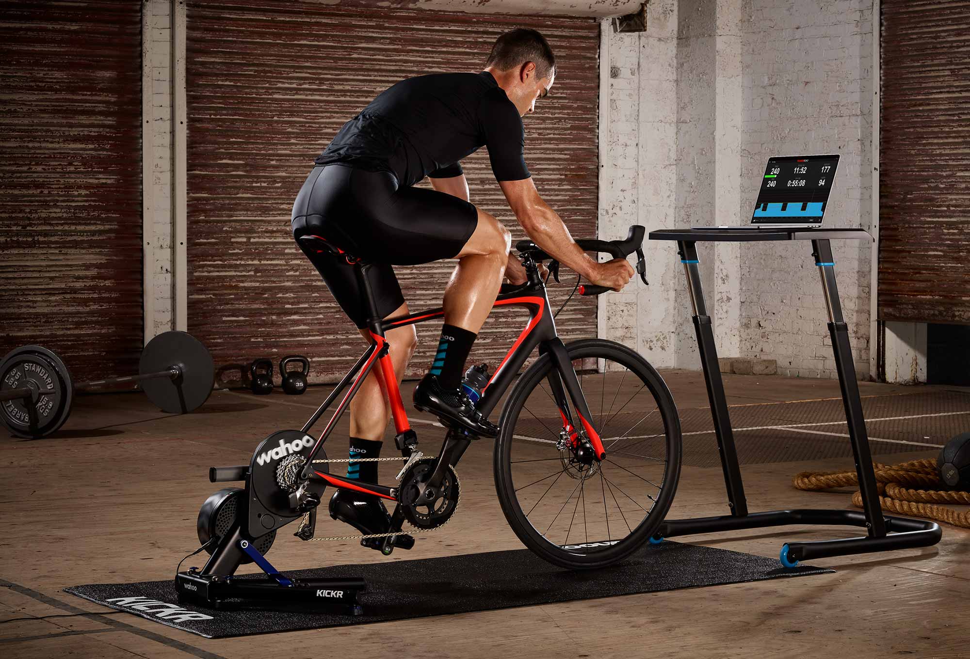 • Support intégré pour tablette et smartphone : Maintenez votre tablette ou smartphone bien en place sur le bureau et affichez votre appli de cyclisme sur votre KICKR ou votre écran pendant l’entraînement.